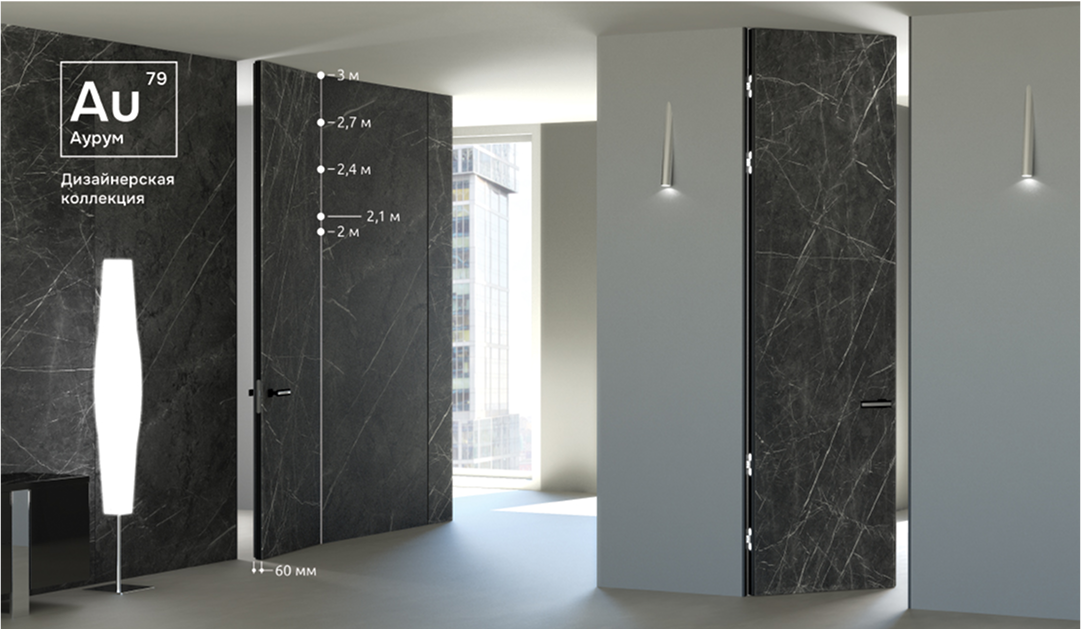 Коллекция Aurum представлена в широком размерном диапазоне. Двери из этой коллекции по высоте могут достигать высоты 3 м и устанавливаться «под потолок» без верхней перемычки. Уникальная конструкция короба, состоящая из алюминиевого профиля, не подвержена деформации при изменении влажности и температуры, что гарантирует повышенную жесткость и прочность всей двери.