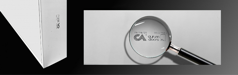 Все полотна Aurum Doors будут маркироваться на кромке дверного полотна при помощи каплеструйного принтера. Это поможет идентифицировать дверные полотна Aurum после монтажа. После установки и не выявлении каких-либо проблем с дверным полотном, маркировка легко стирается с помощью спиртового раствора.